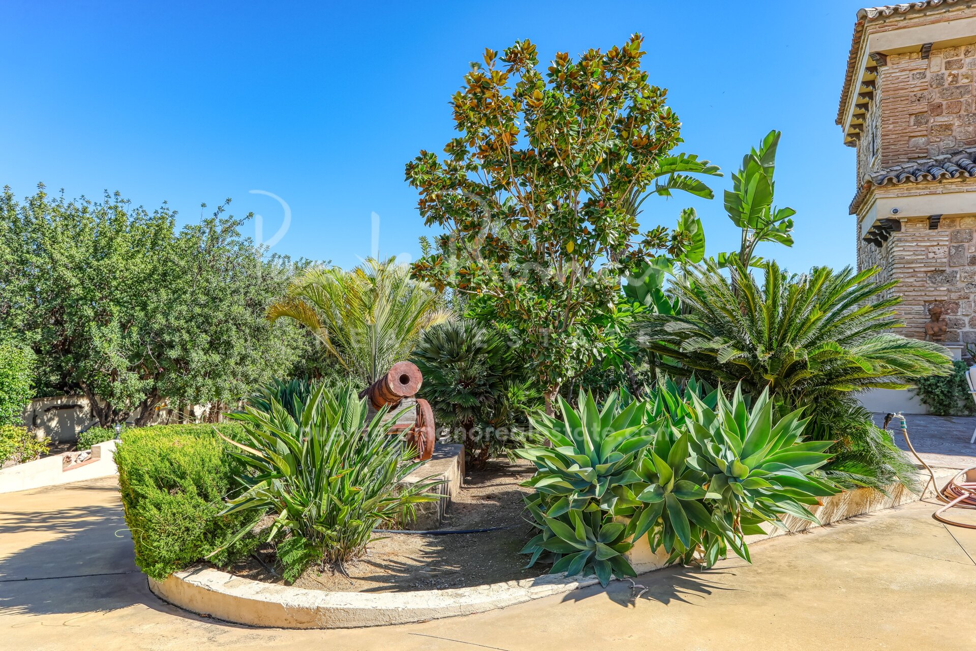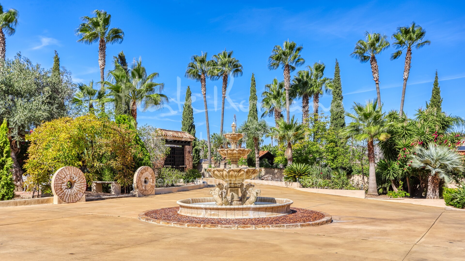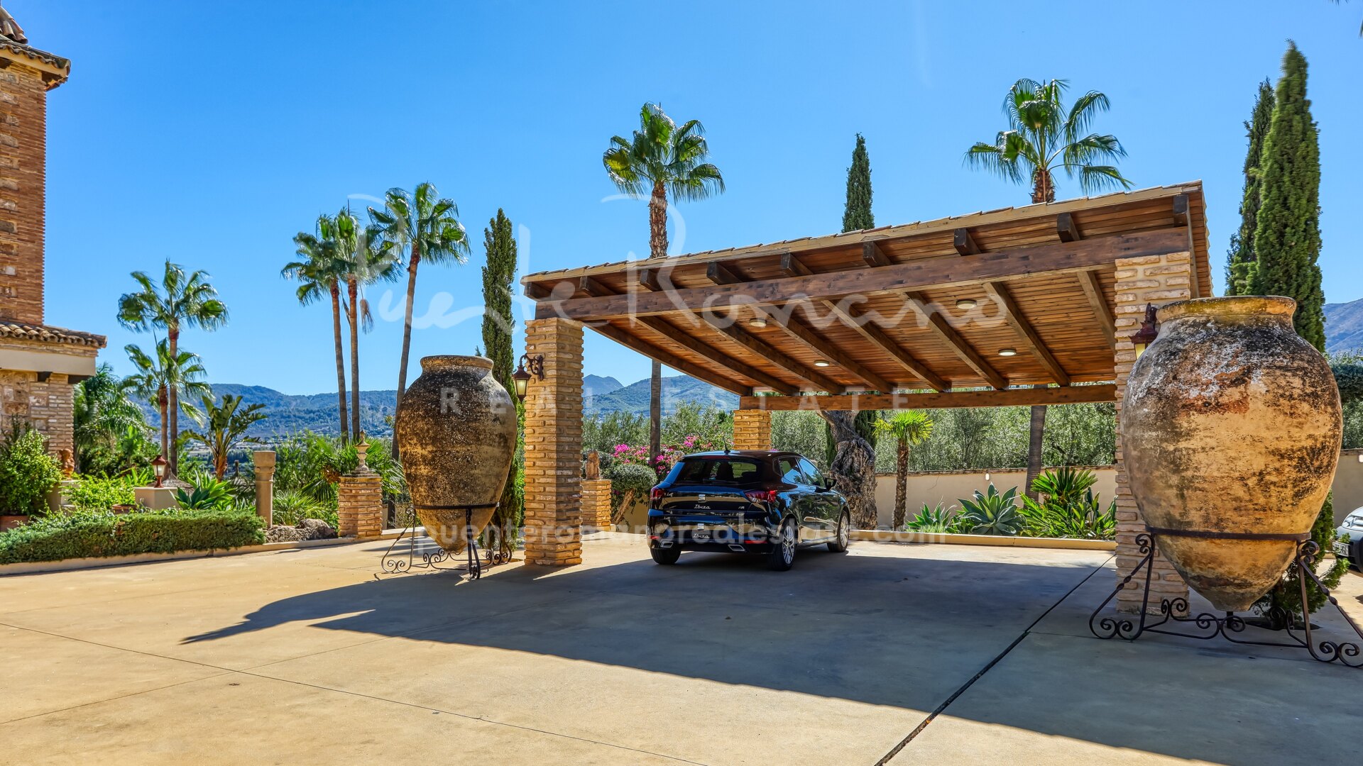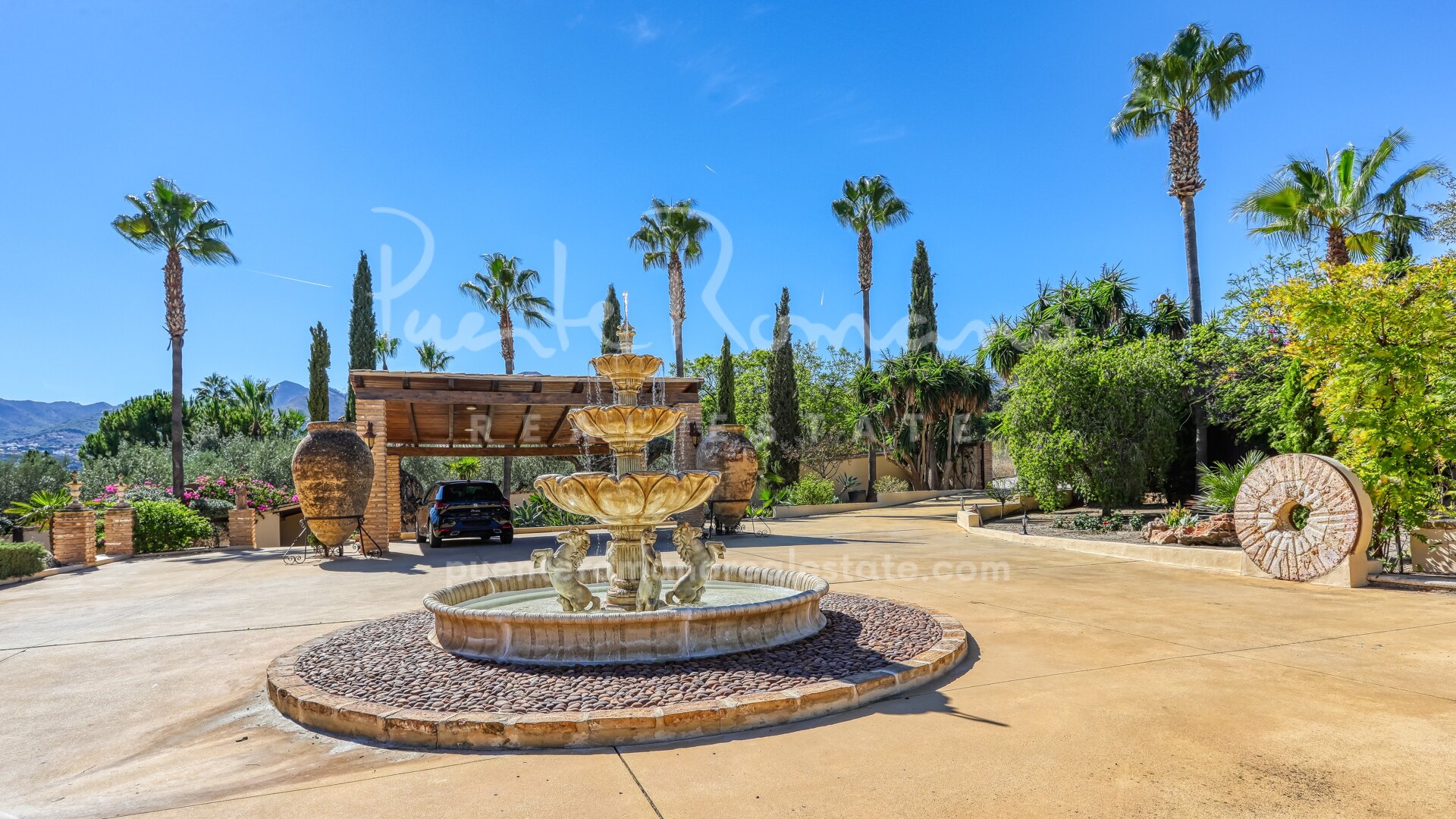 Exceptional very private estate, located in a quiet area with unbeatable panoramic views of the coast and the mountains, but only 20 minutes from Malaga airport and the beach. It is accessed by a wide access for vehicles, with very large spaces, surrounded by palm trees and a mature garden, with a central source and carport for several vehicles.