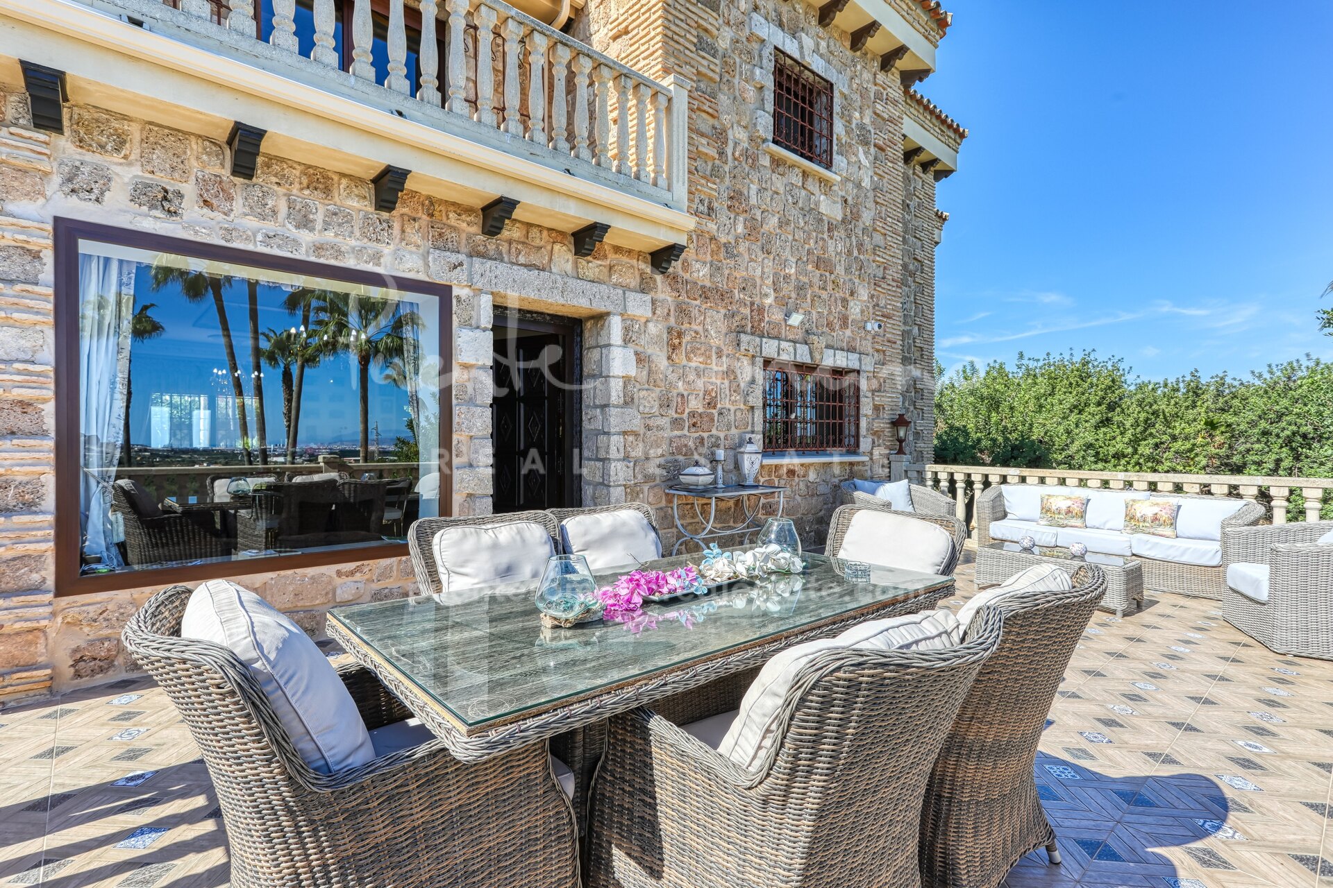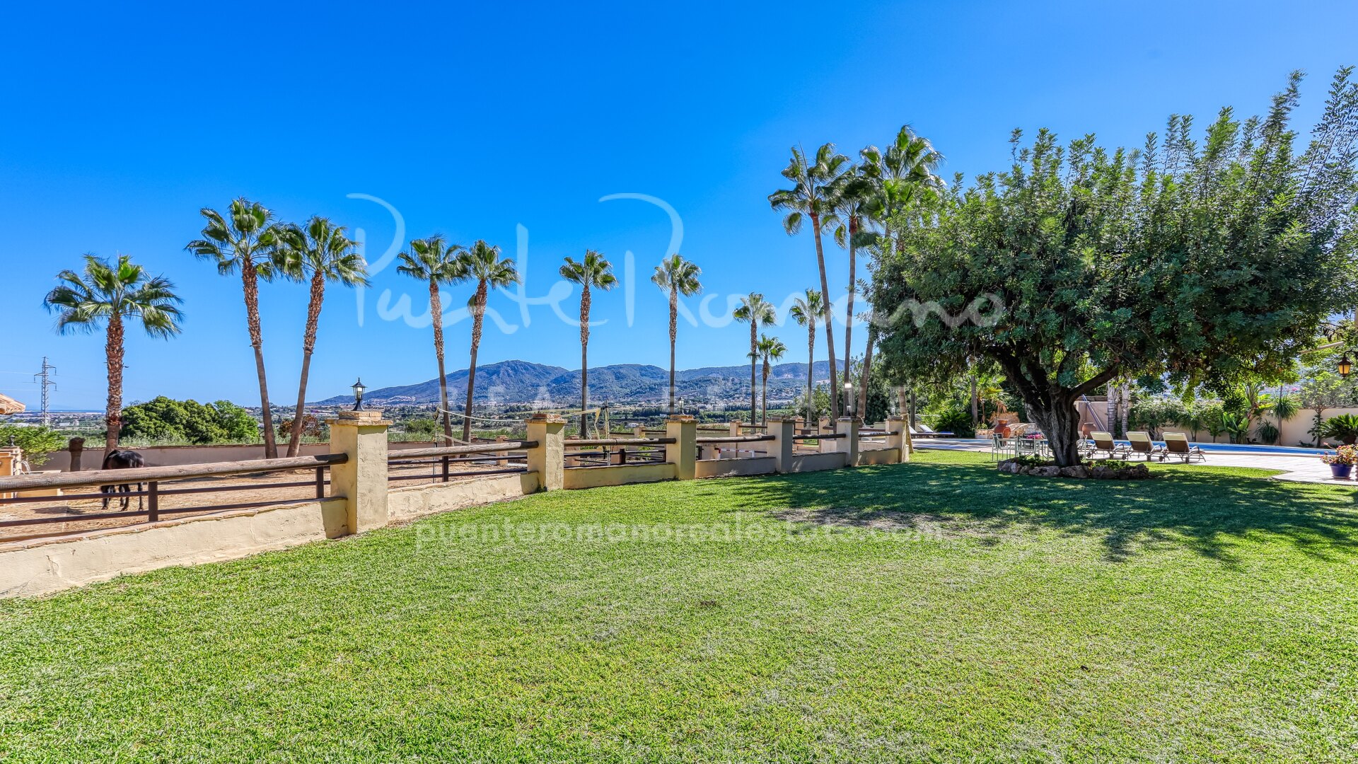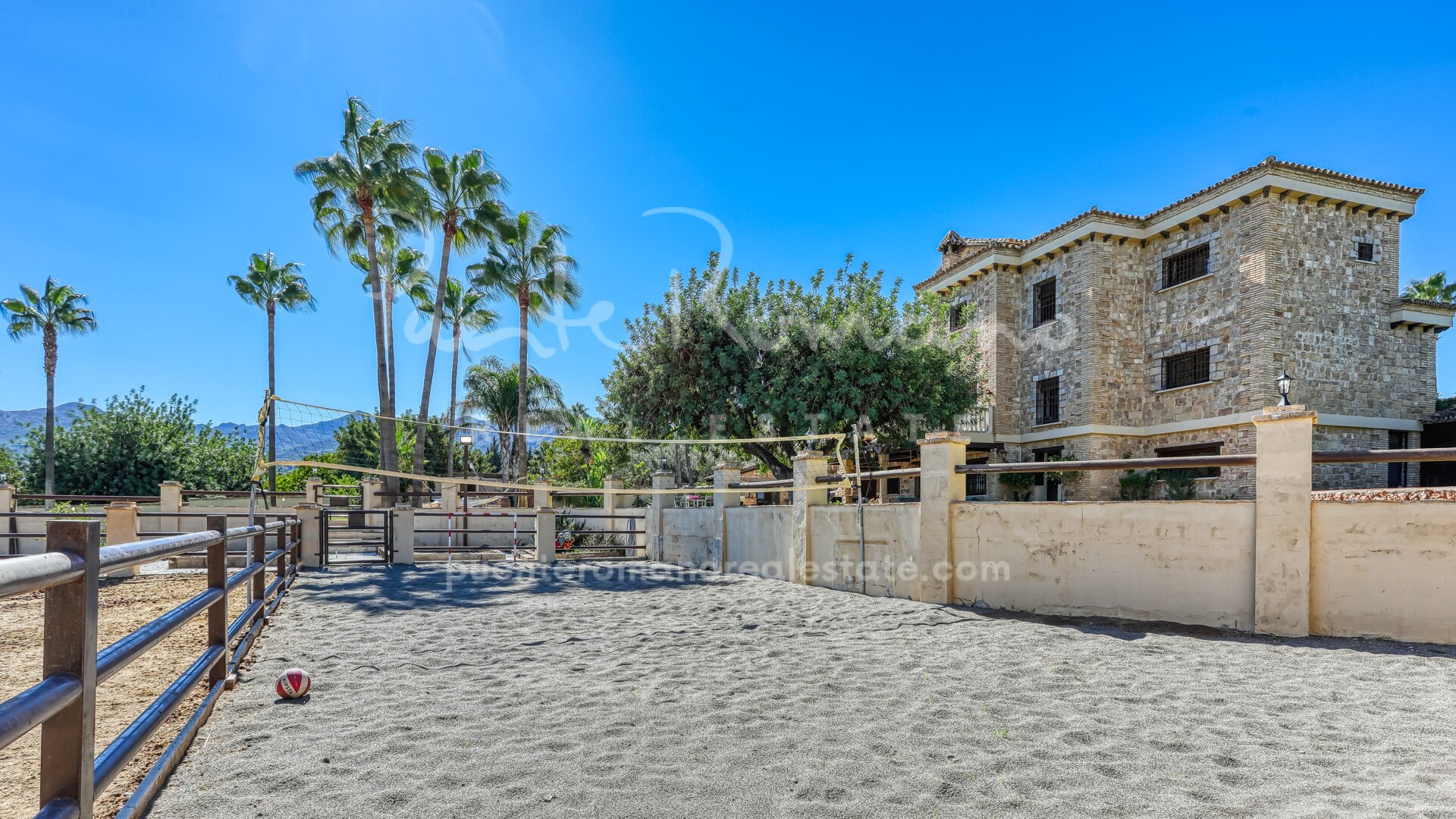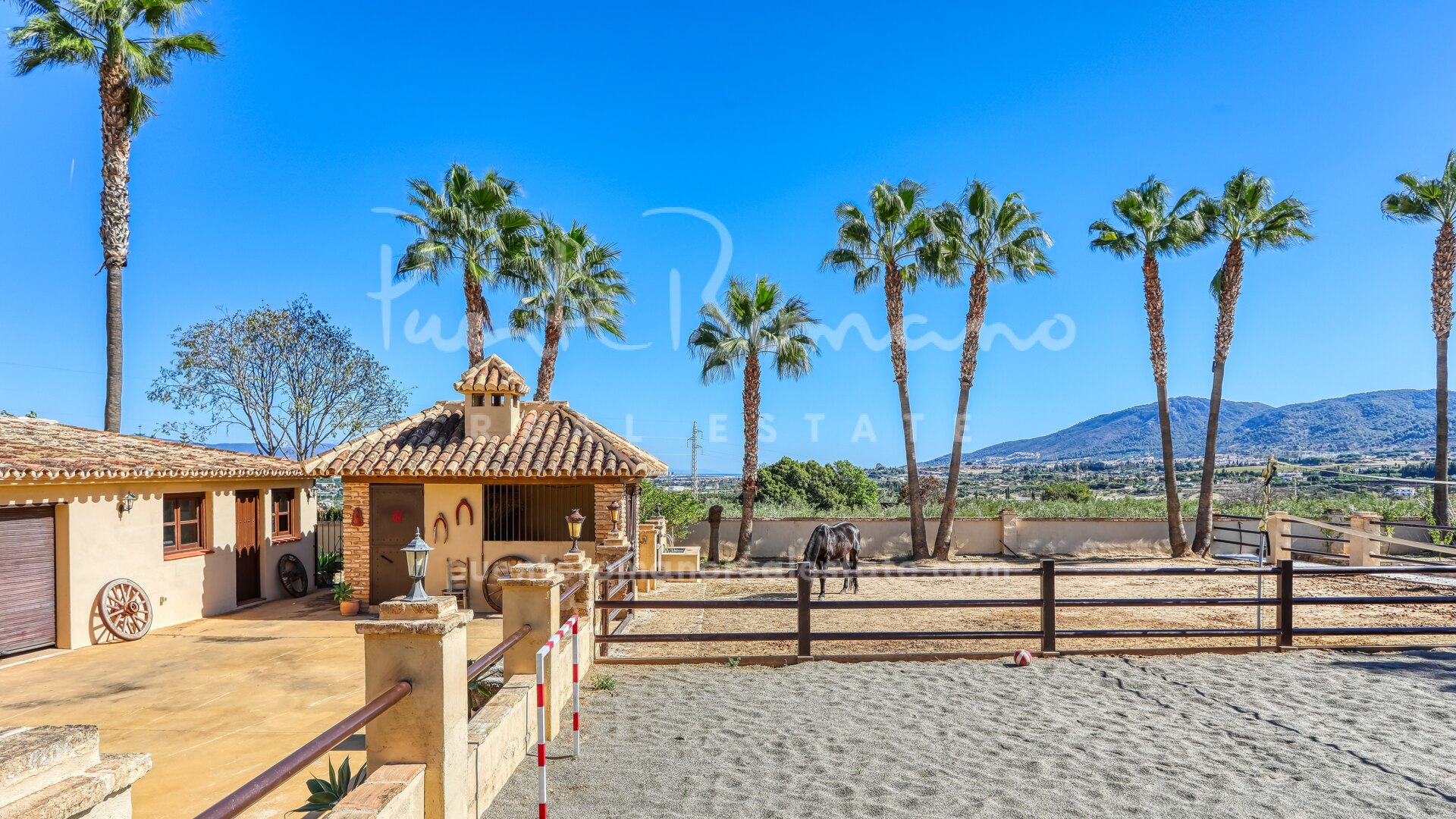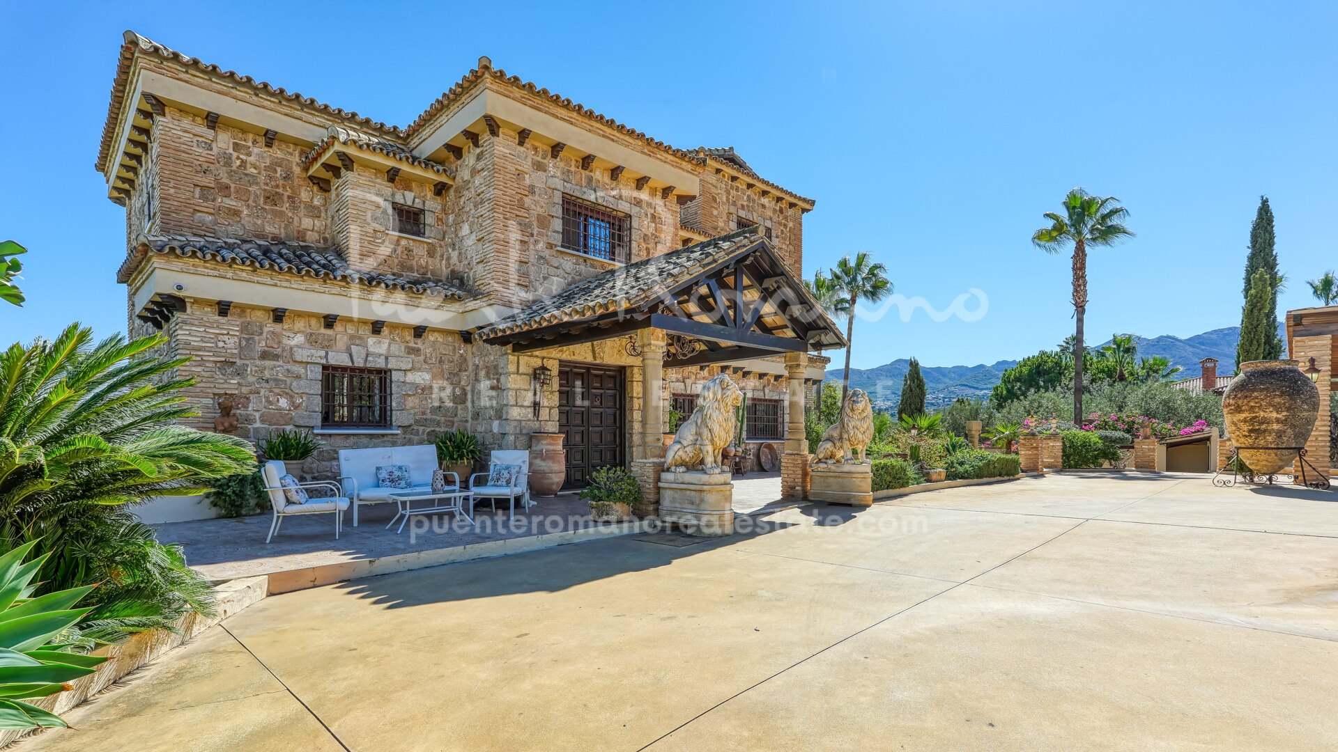 Exceptional very private estate, located in a quiet area with unbeatable panoramic views of the coast and the mountains, but only 20 minutes from Malaga airport and the beach. It is accessed by a wide access for vehicles, with very large spaces, surrounded by palm trees and a mature garden, with a central source and carport for several vehicles.