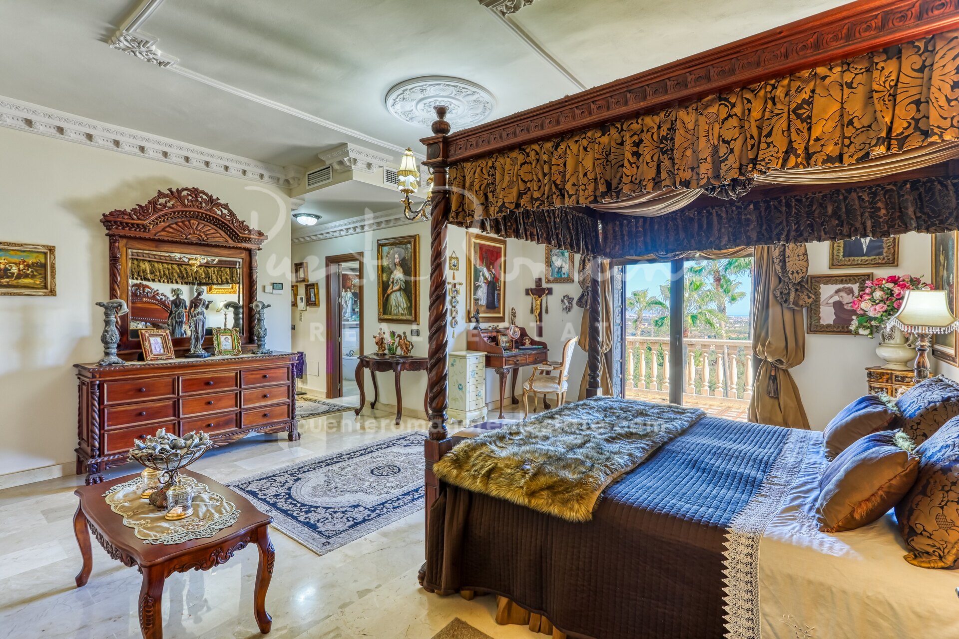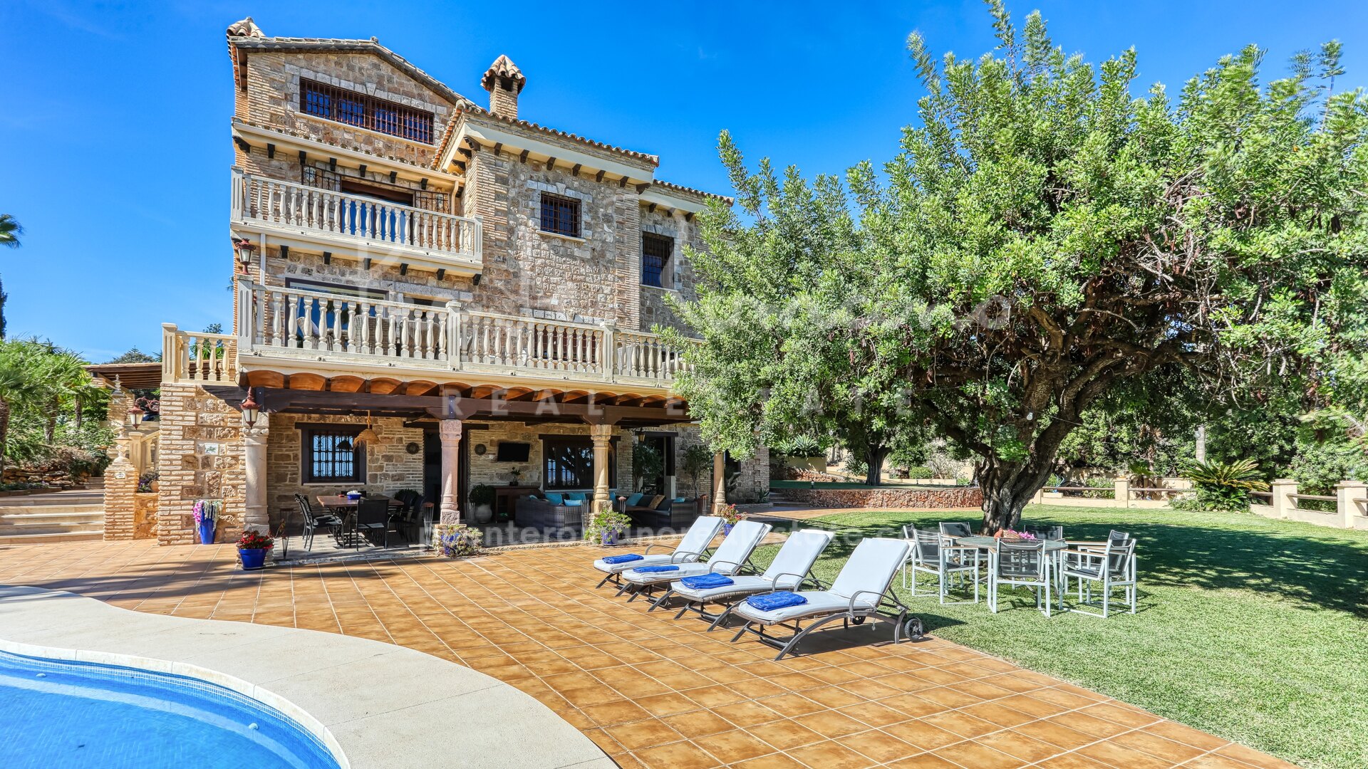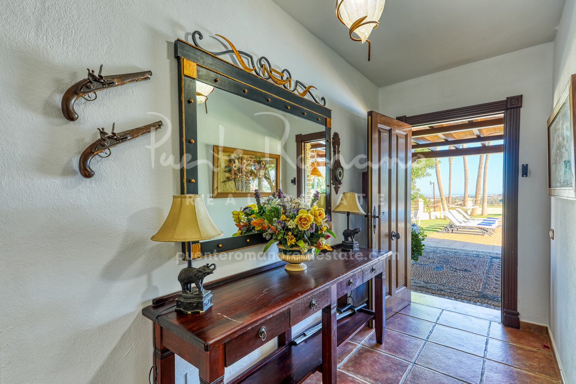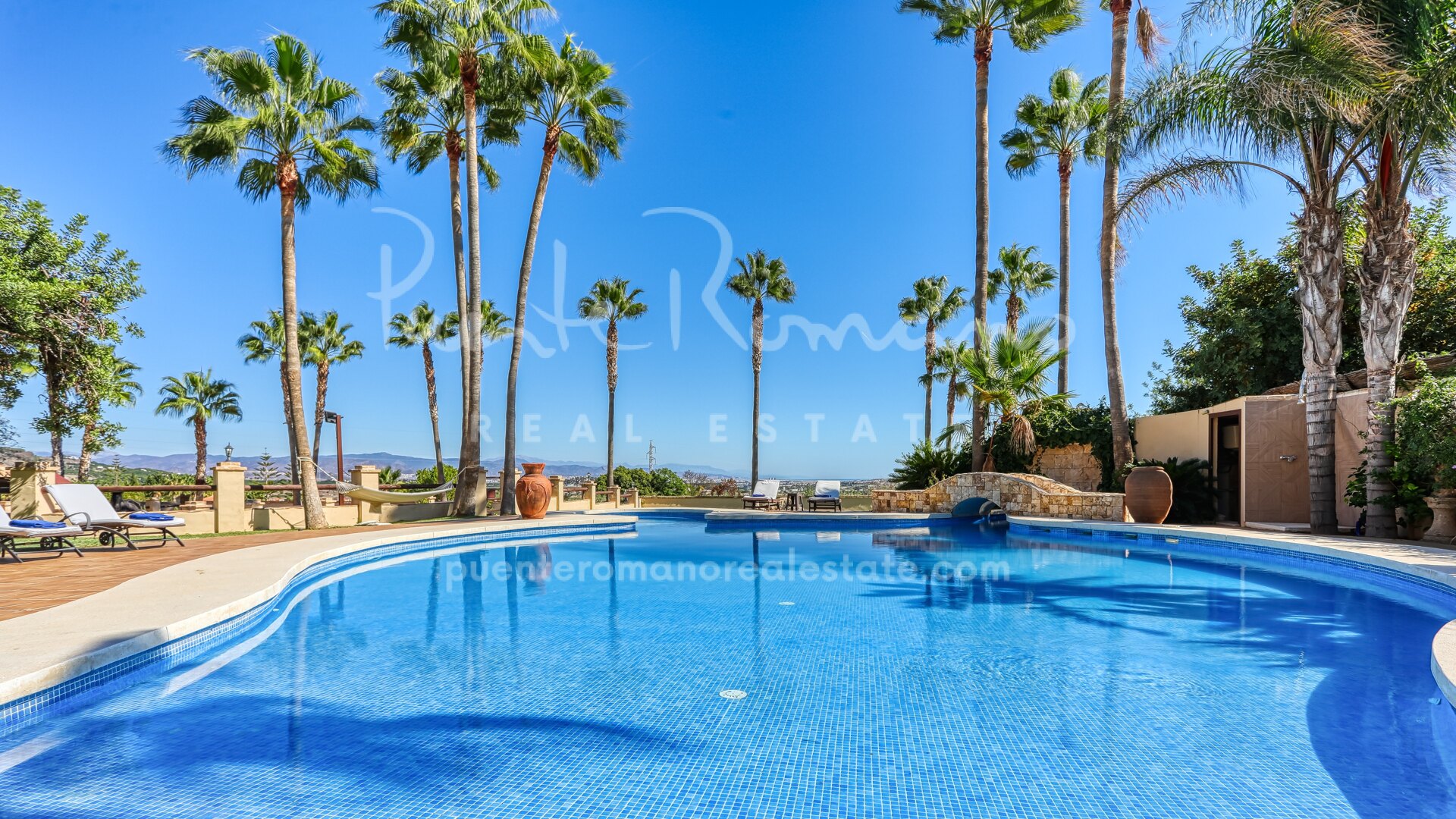 Exceptional very private estate, located in a quiet area with unbeatable panoramic views of the coast and the mountains, but only 20 minutes from Malaga airport and the beach. It is accessed by a wide access for vehicles, with very large spaces, surrounded by palm trees and a mature garden, with a central source and carport for several vehicles.