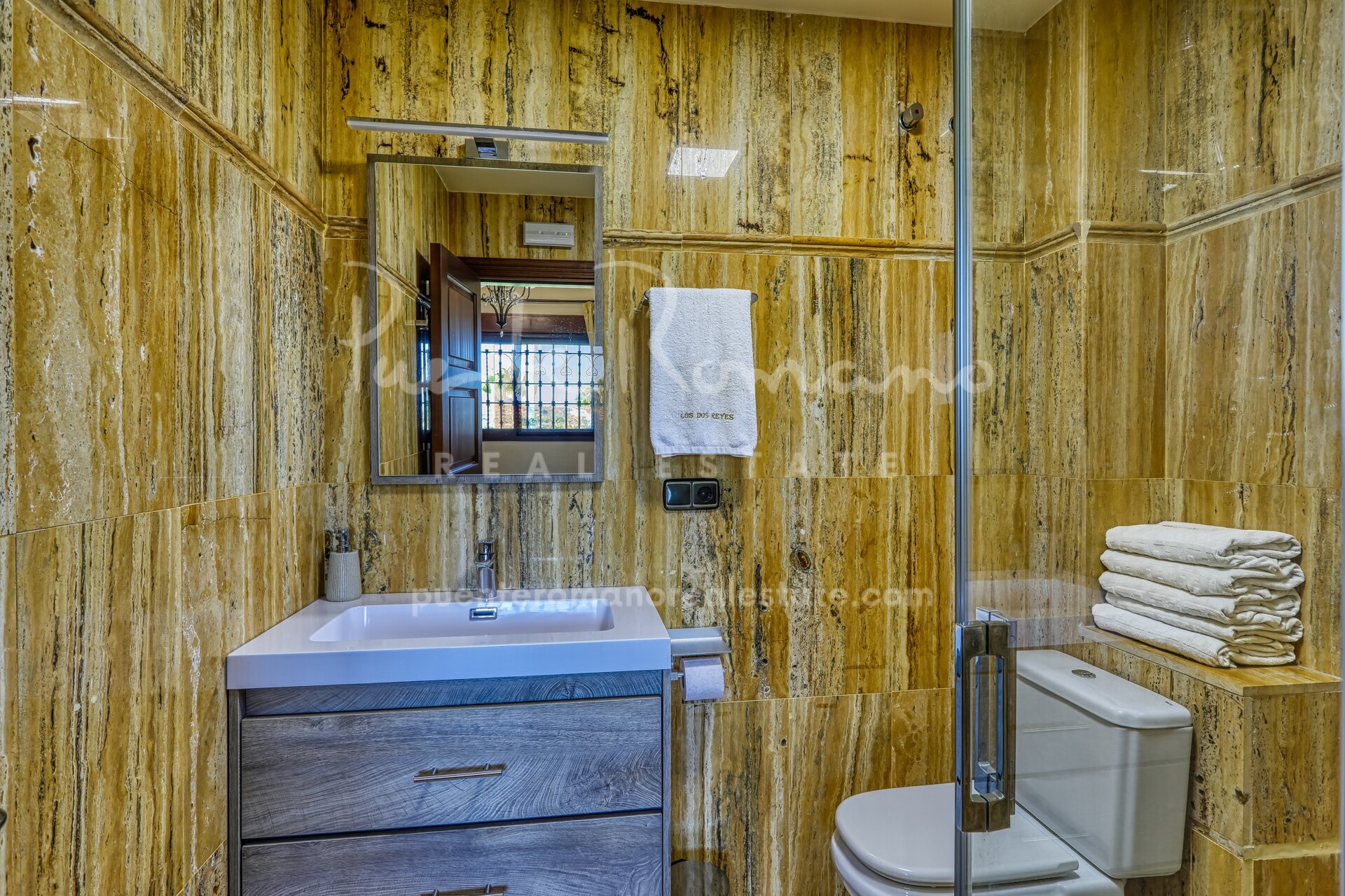 The lower floor is fully independent and consists of: living room, kitchen, toilet and three bedrooms sharing a bathroom and access to a large porch next to the salt water pool with beach and jacuzzi, summer kitchen, fridge, garden and stable for horses.